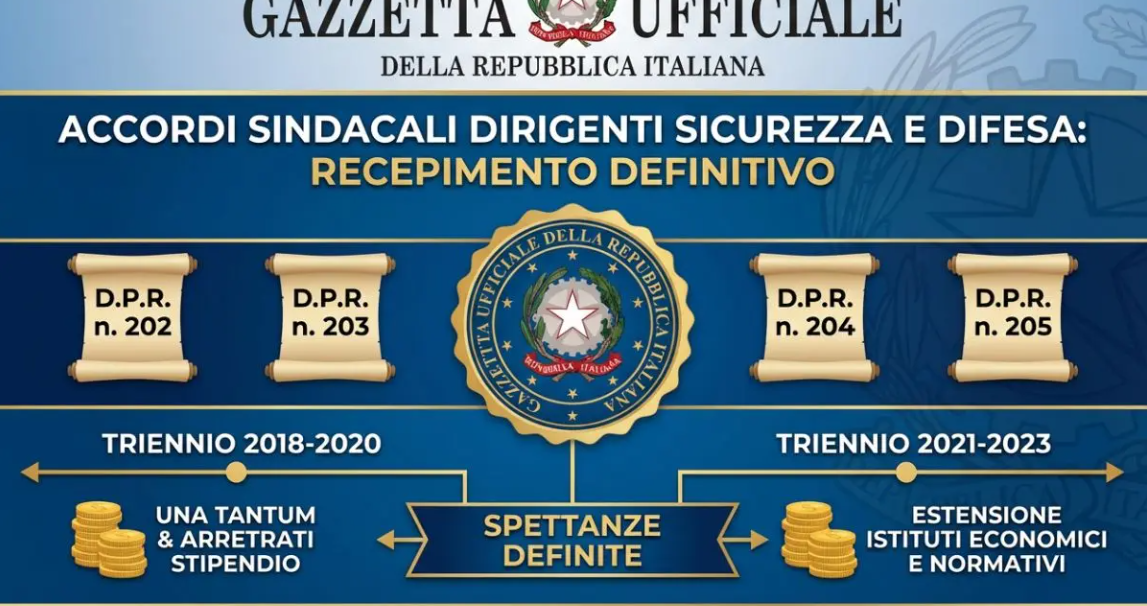 Dopo mesi di attesa sono stati pubblicati sulla Gazzetta Ufficiale 302 del 31 dicembre 2025 i decreti del Presidente della Repubblica n.202 e n.204,che recepiscono gli accordi sindacali per il personale dirigente delle Forze Armate.